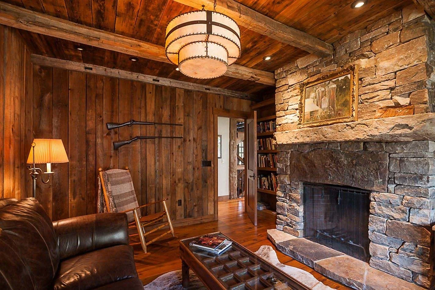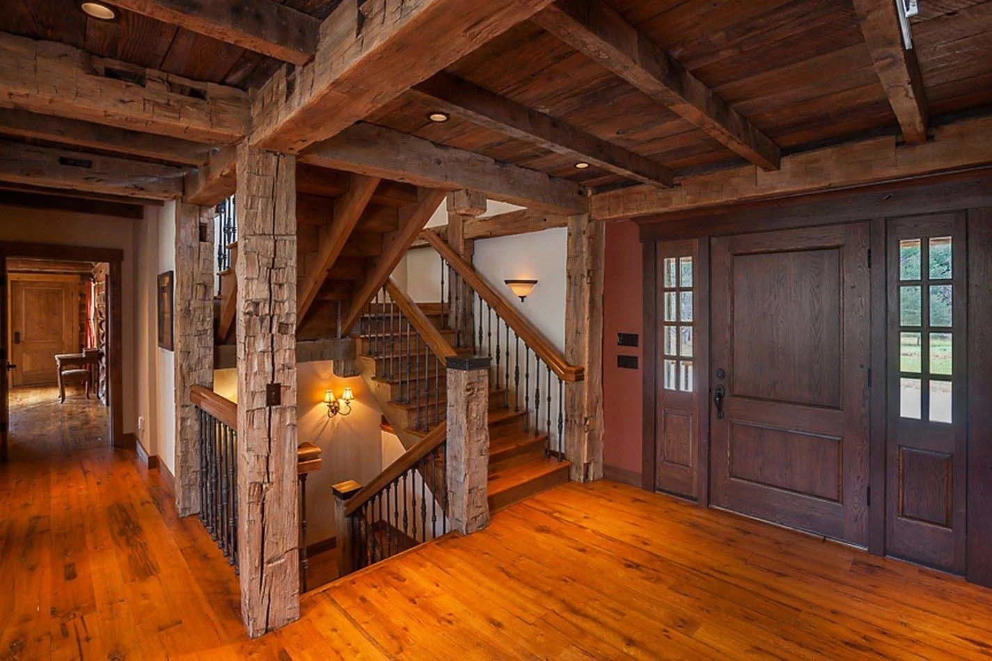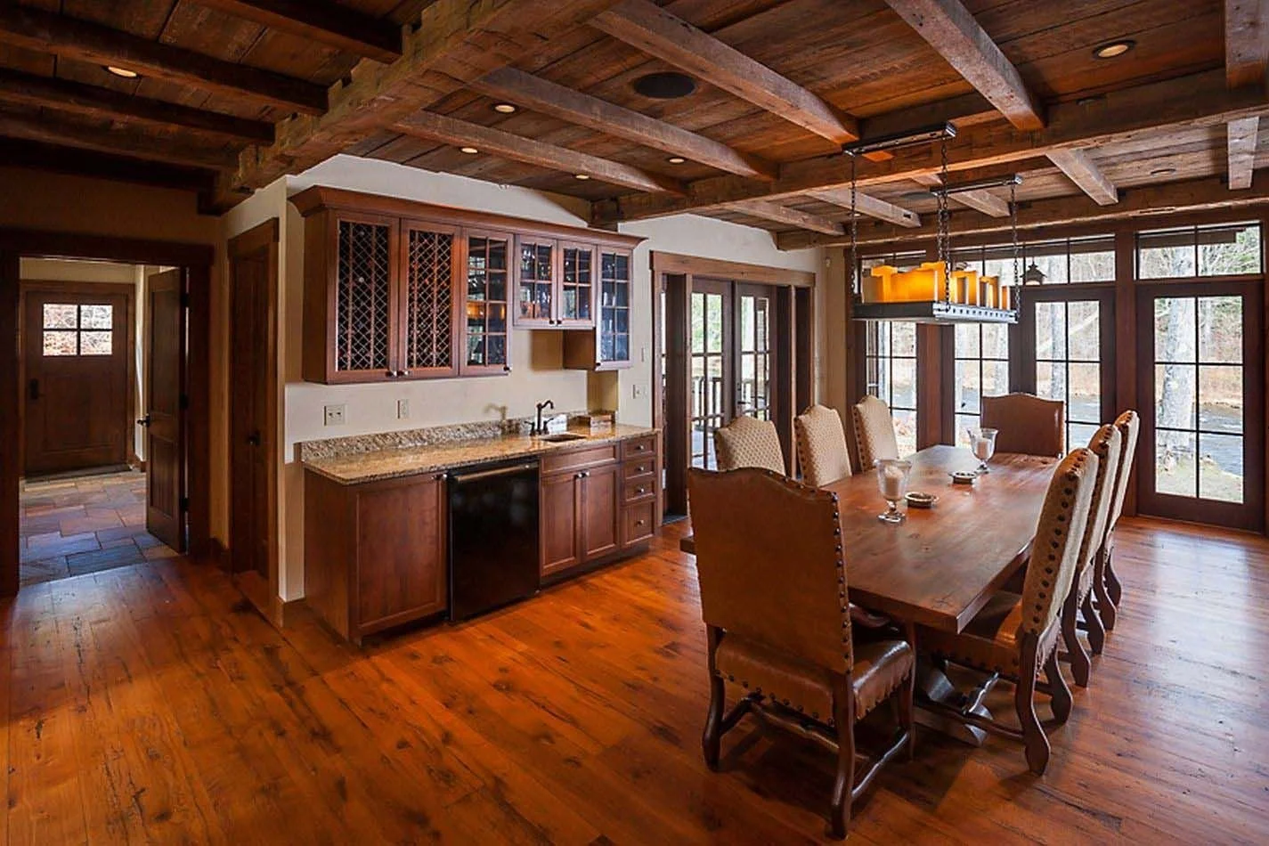 Custom fabricated steel turnbuckles supporting reclaimed beams, two stone wood burning fireplaces, coffered ceilings with tin accents, reclaimed rustic oak floors, hand-forged and reclaimed metalwork, custom cabinetry and reclaimed wood furniture, along with a 700-bottle custom wine cellar and reclaimed bar complete with stained concrete floors gracing the lower level.