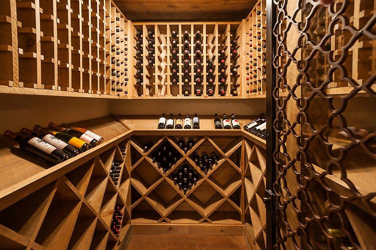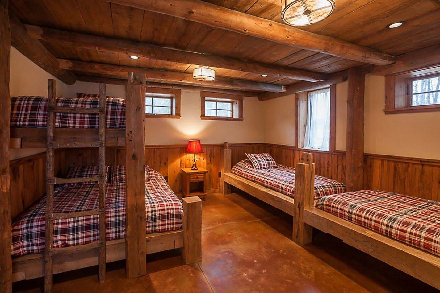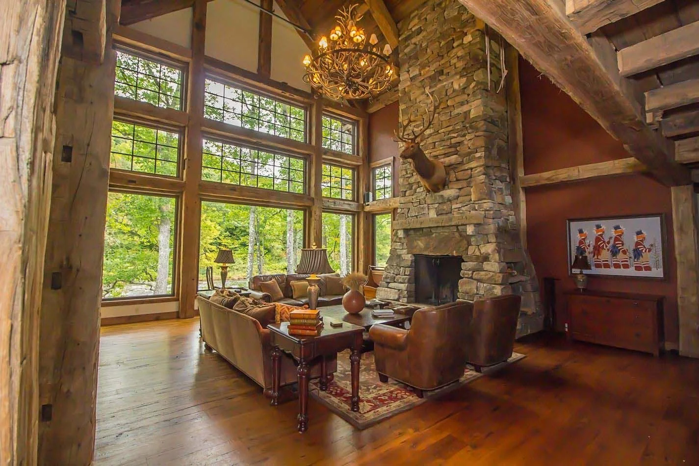 Custom fabricated steel turnbuckles supporting reclaimed beams, two stone wood burning fireplaces, coffered ceilings with tin accents, reclaimed rustic oak floors, hand-forged and reclaimed metalwork, custom cabinetry and reclaimed wood furniture, along with a 700-bottle custom wine cellar and reclaimed bar complete with stained concrete floors gracing the lower level.