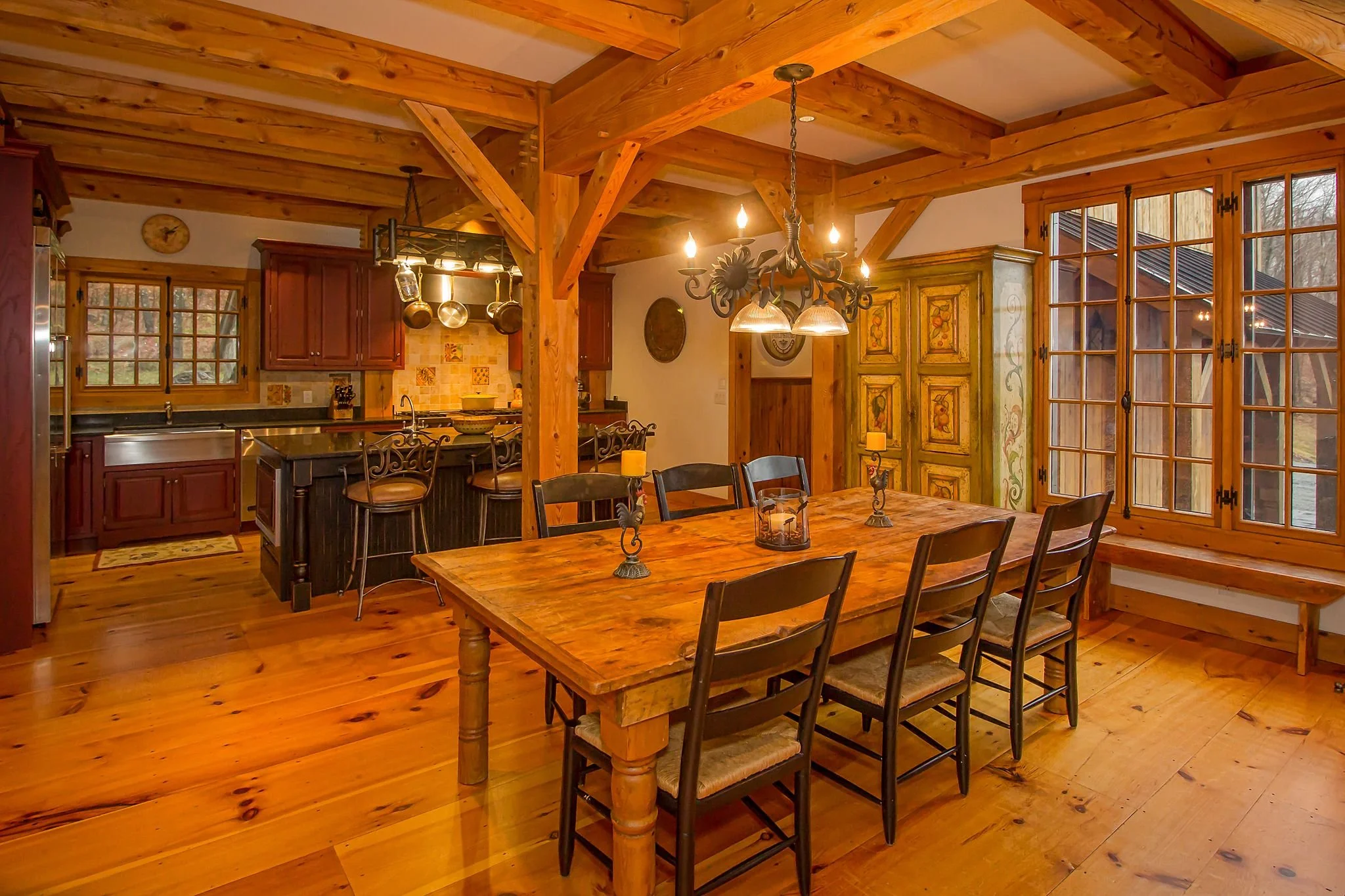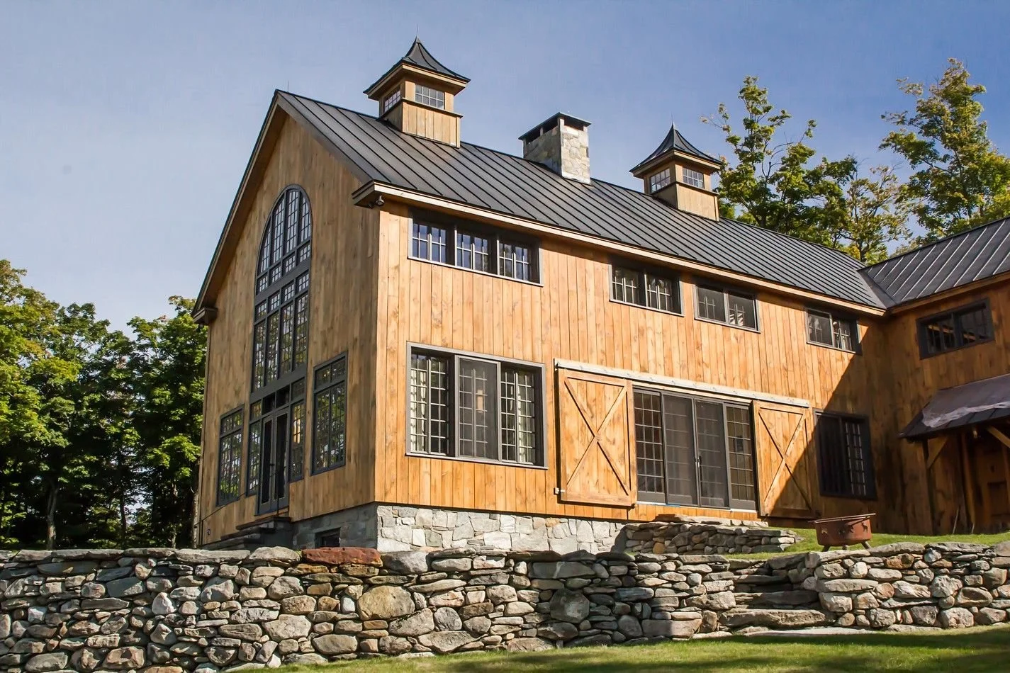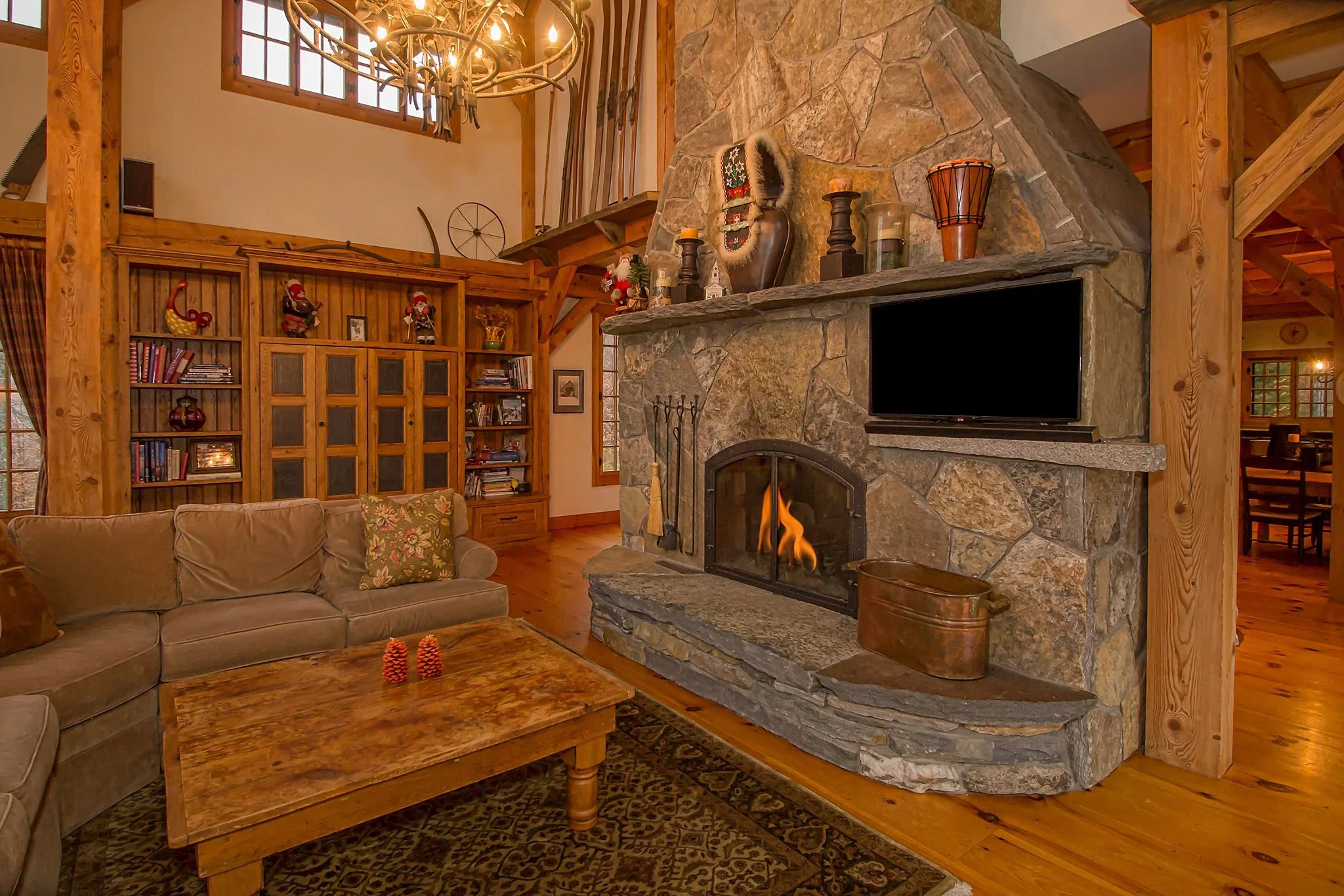 A two and a half story great room with floor to ceiling windows, wide plank pine floors, a large two-sided stone fireplace, custom sliding barn doors on the exterior to protect the sliding doors from inclement winter weather, the exterior of the home is also adorned with two boulder retaining walls finished with a large stone patio to take in the extraordinary view.