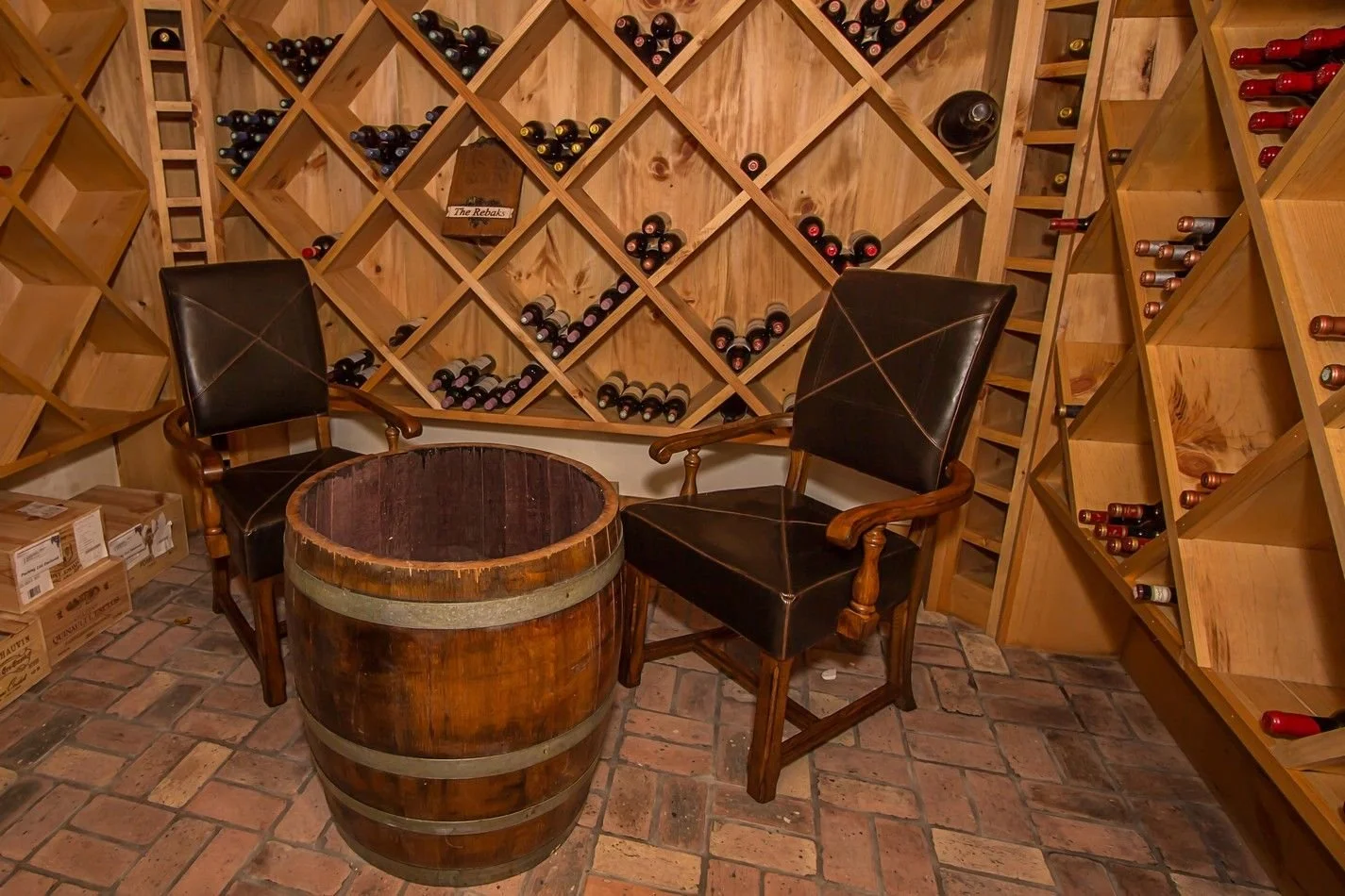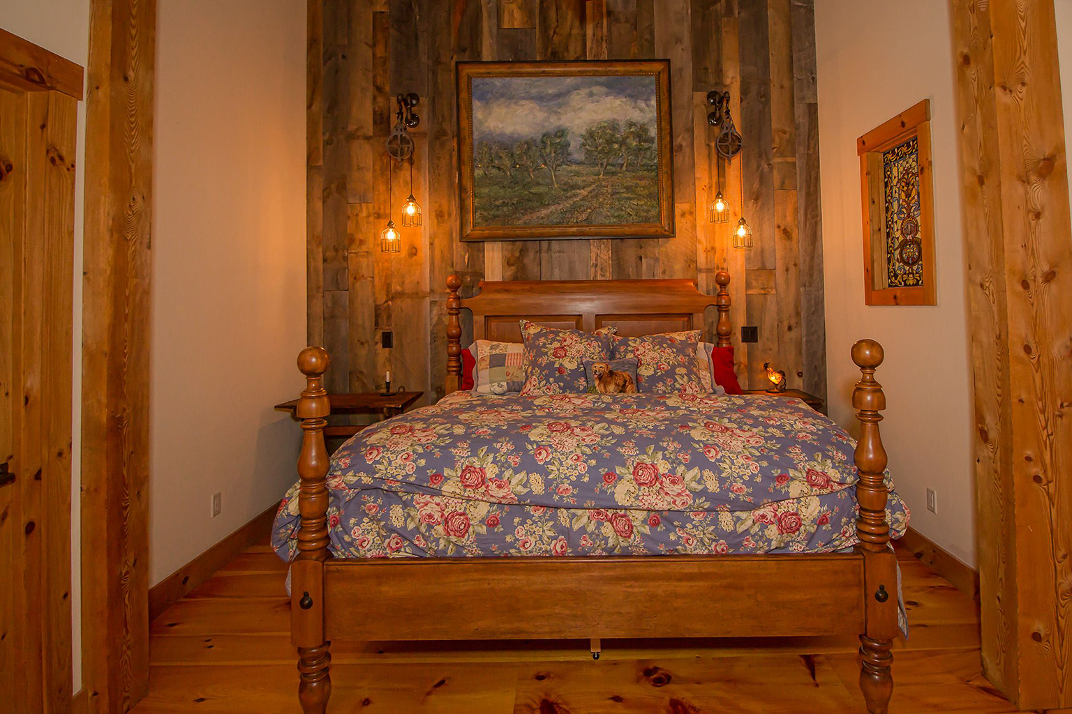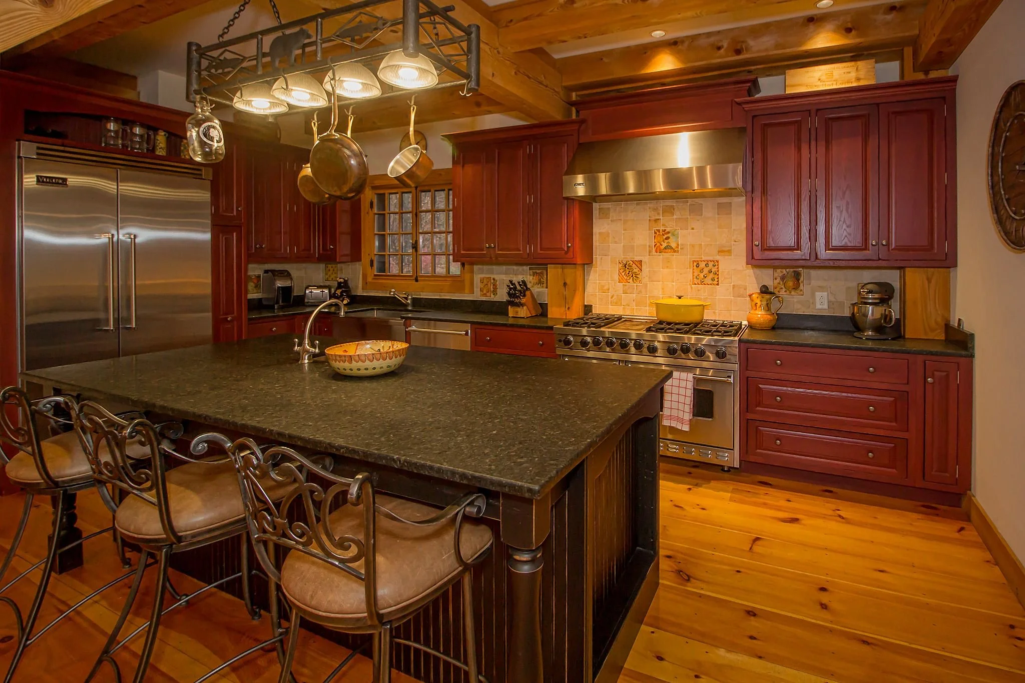 A two and a half story great room with floor to ceiling windows, wide plank pine floors, a large two-sided stone fireplace, custom sliding barn doors on the exterior to protect the sliding doors from inclement winter weather, the exterior of the home is also adorned with two boulder retaining walls finished with a large stone patio to take in the extraordinary view.