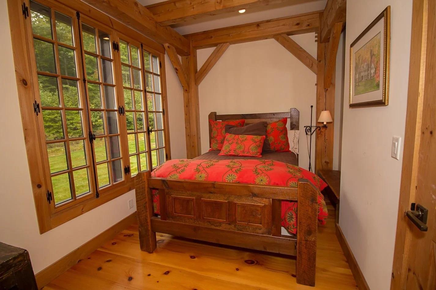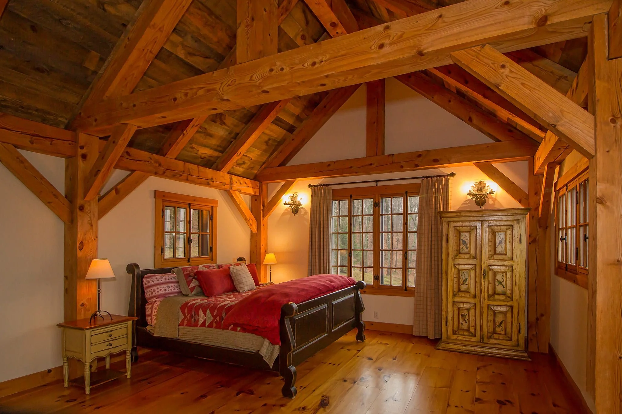 Mountain View is perched on one of the highest building elevations in Vermont. This pine timber frame home features expansive views of Mount Snow. The exterior is clad in vertical pine boards accompanied by vast expanses of windows to provide optimal views from within. Two signature cupolas punctuate the roofline of this barn style residence.